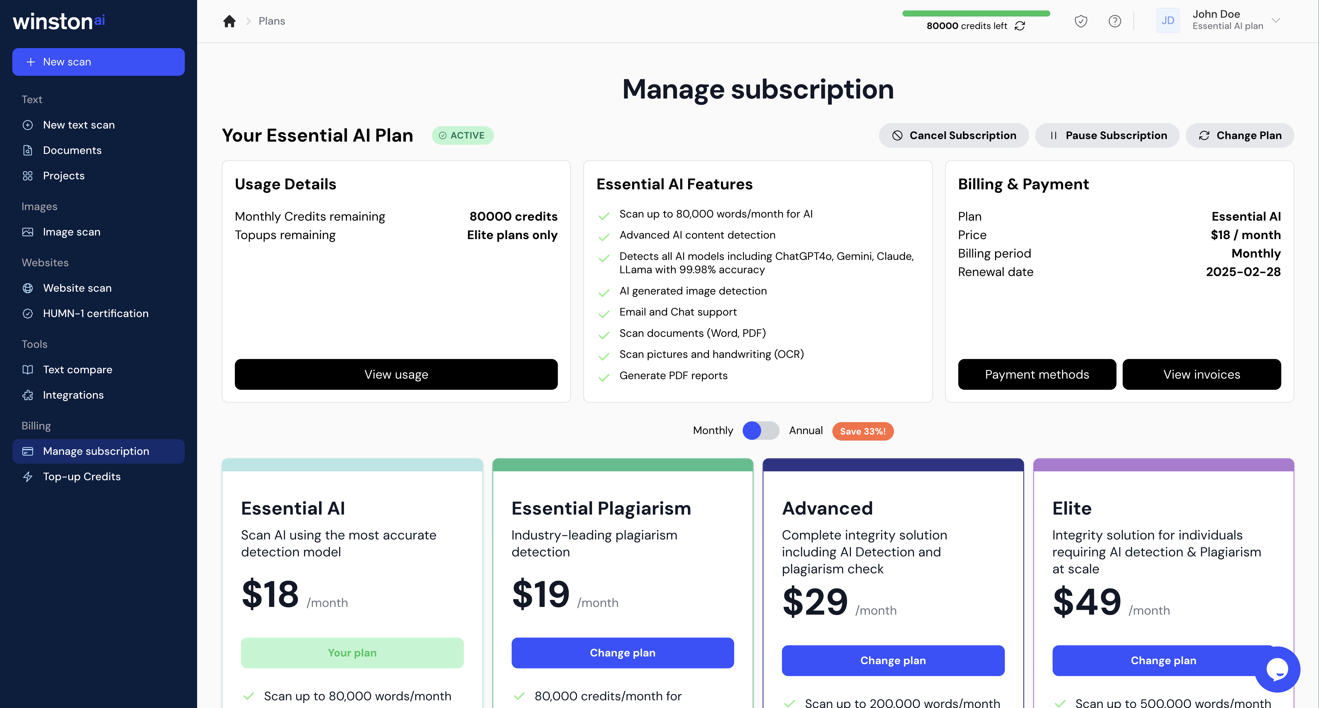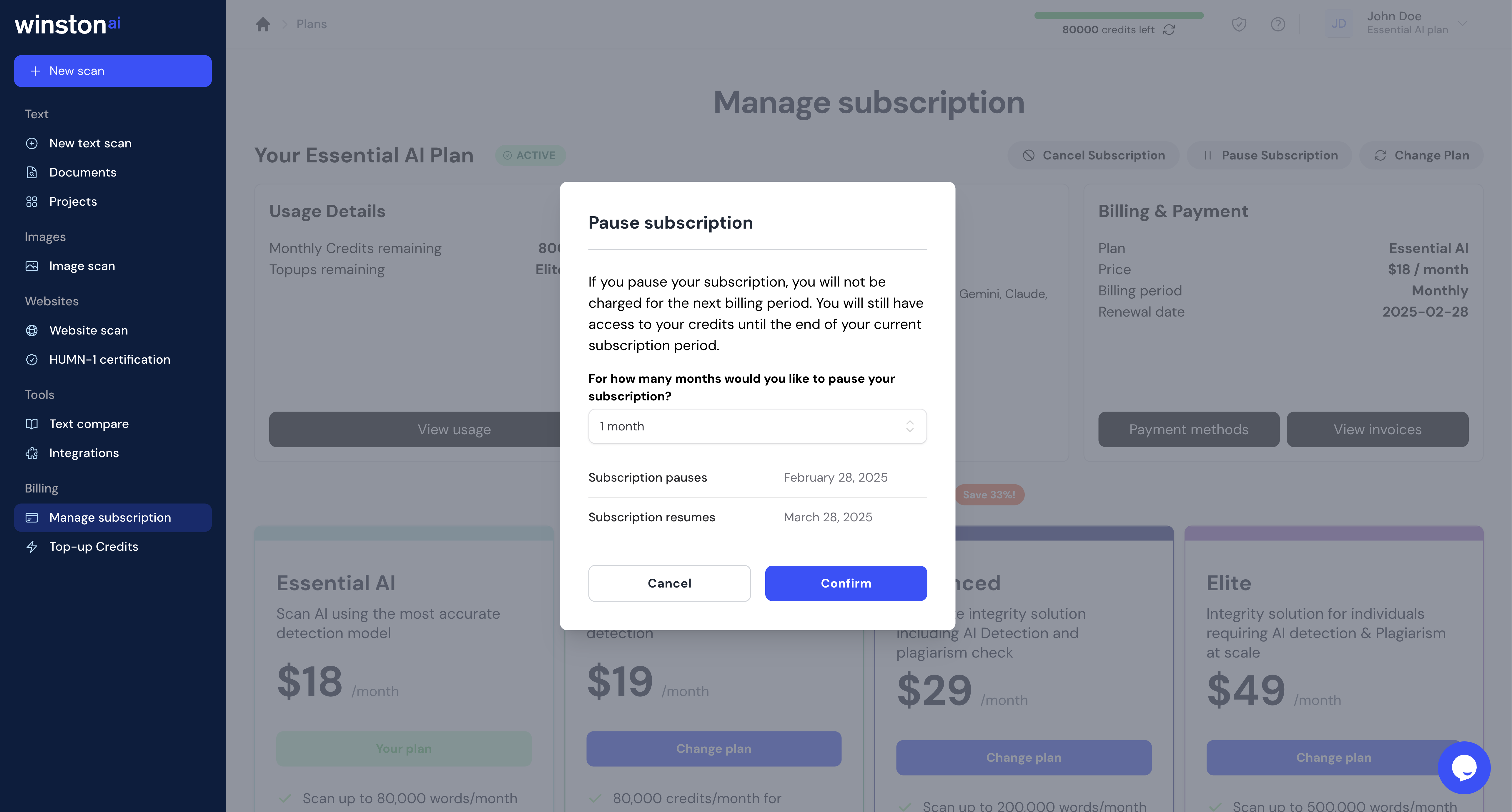 Once the selected pause duration (1–6 months) has elapsed, Winston AI automatically resumes your subscription.